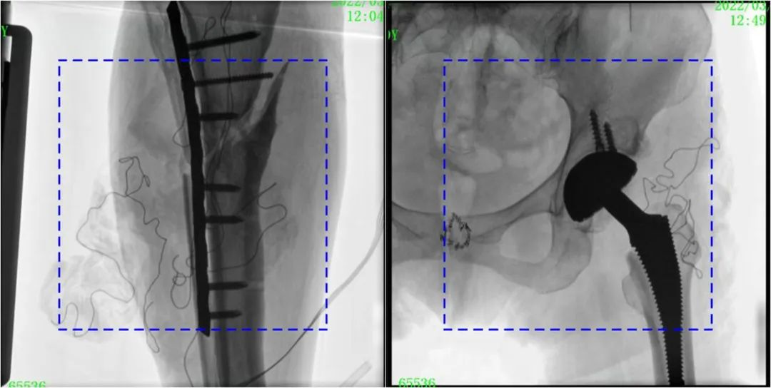 普愛醫(yī)療大平板一體式C形臂圖像與傳統(tǒng)圖像對(duì)比(藍(lán)色虛線內(nèi)為傳統(tǒng)21CM×21CM平板的成像區(qū)域)